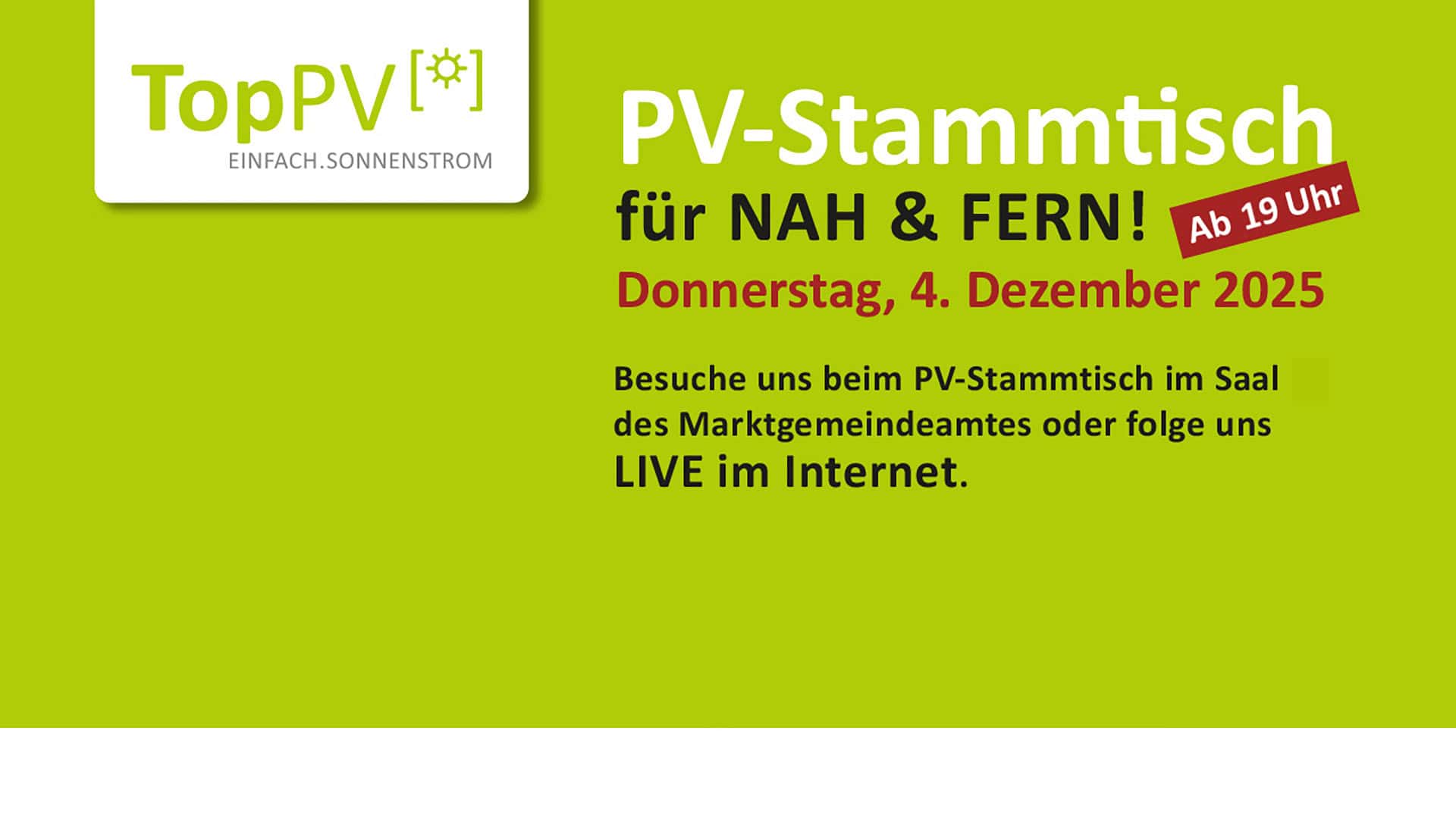 TopPV lädt zu einem „PV-Stammtisch für NAH & FERN“ am Donnerstag, 4. Dezember 2025, ab 19:00 Uhr, in den Saal des Marktgemeindeamtes Weißkirchen ein.